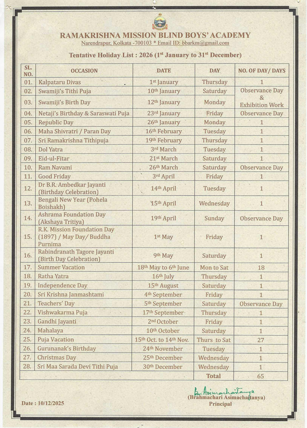 Tentative Holidays